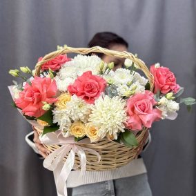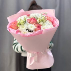 Состав: розы, хризантема, роза кустовая, эустома, рускус.