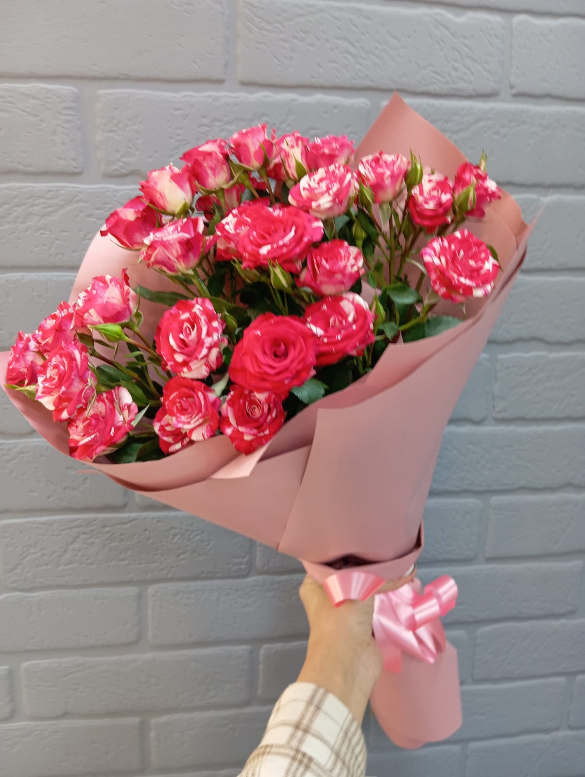 Состав: ажурные розы, хризантема, гипсофила, эустома, кустовая гвоздика, рускус.